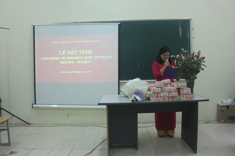 Hòa chung không khí của những ngày đầu xuân mới của nhân dân cả nước đang thi đua lập thành tích mừng Đảng, mừng Xuân, mừng Đại hội Phụ nữ toàn quốc lần thứ XII, sáng ngày 08/3/2017, Công đoàn Trường Trung cấp nghề Cơ khí xây dựng phối hợp với Ban Nữ công long trọng tổ chức Mít tinh Kỷ niệm 107 năm ngày Quốc tế phụ nữ 8/3. Tham dự buổi lễ có Bí thư Đảng ủy, Hiệu trưởng Nhà trường – thầy Nguyễn Trần Long; đồng chí Phạm Văn Tự – Phó Hiệu trưởng. Về phía Công đoàn có đồng chí Đào Văn Tiên - Chủ tịch Công đoàn cùng một số đại biểu khách quý và 24 đại biểu nữ thuộc các phòng, khoa, đơn vị thuộc Trường đã đến dự buổi Mít tinh.