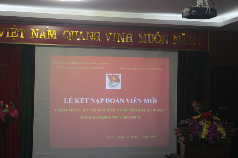 Thực hiện Chương trình năm học; đồng thời nâng cao nhận thức về Đoàn TNCS Hồ Chí Minh, về ý nghĩa vinh dự của người đoàn viên TNCS Hồ Chí Minh. Nhân dịp kỷ niệm 88 năm ngày thành lập Đoàn TNCSHCM (26/3/1931 – 26/3/2019) sáng ngày 26/3/2019 BCH Đoàn Thanh niên cộng sản Hồ Chí Minh Trường Trung cấp nghề Cơ khí xây dựng đã tiến hành tổ chức Lễ kết nạp cho hơn 70 thanh niên ưu tú của các Chi đoàn K18Đ1B, K19Đ1A, K19Đ1B, K19Đ1C, K19ĐT2A, K19ĐT2B, K19C.