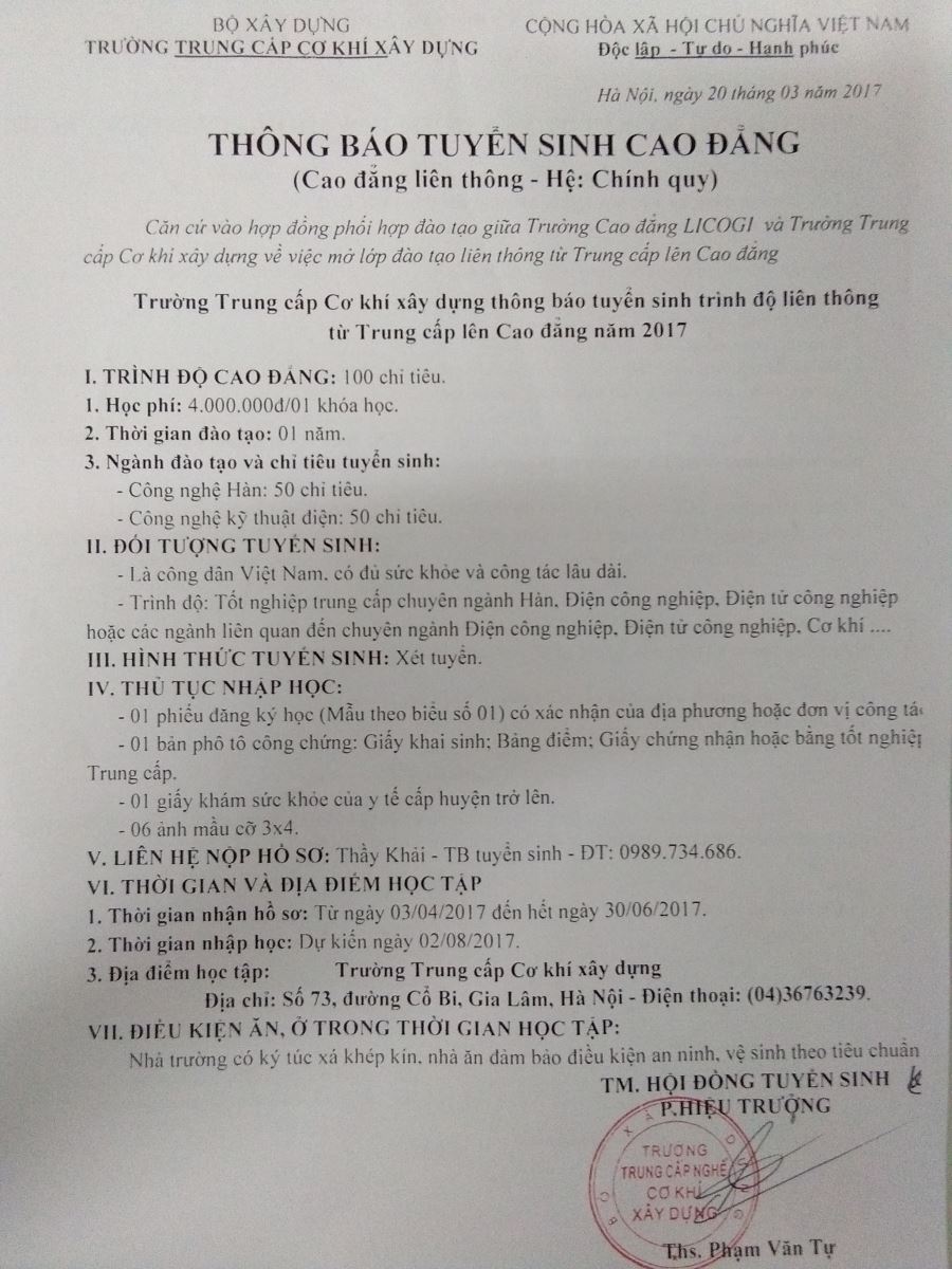 Trường Trung cấp nghề Cơ khí Xây dựng thông báo tuyển sinh trình độ liên thông từ Trung cấp lên Cao đẳng năm 2017, cụ thể như sau: