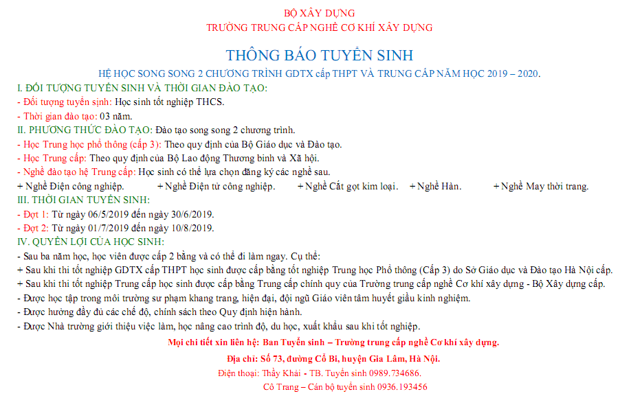 THÔNG BÁO TUYỂN SINH: HỆ HỌC SONG SONG 2 CHƯƠNG TRÌNH GDTX cấp THPT VÀ TRUNG CẤP NĂM HỌC 2019 – 2020.