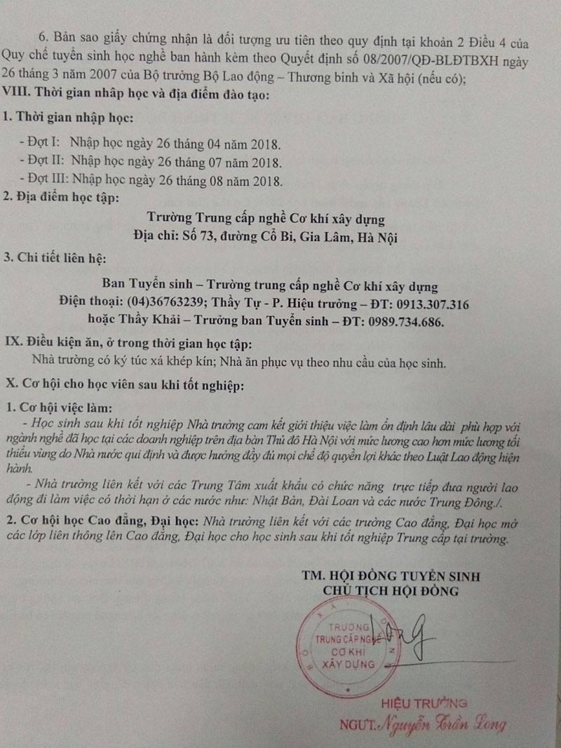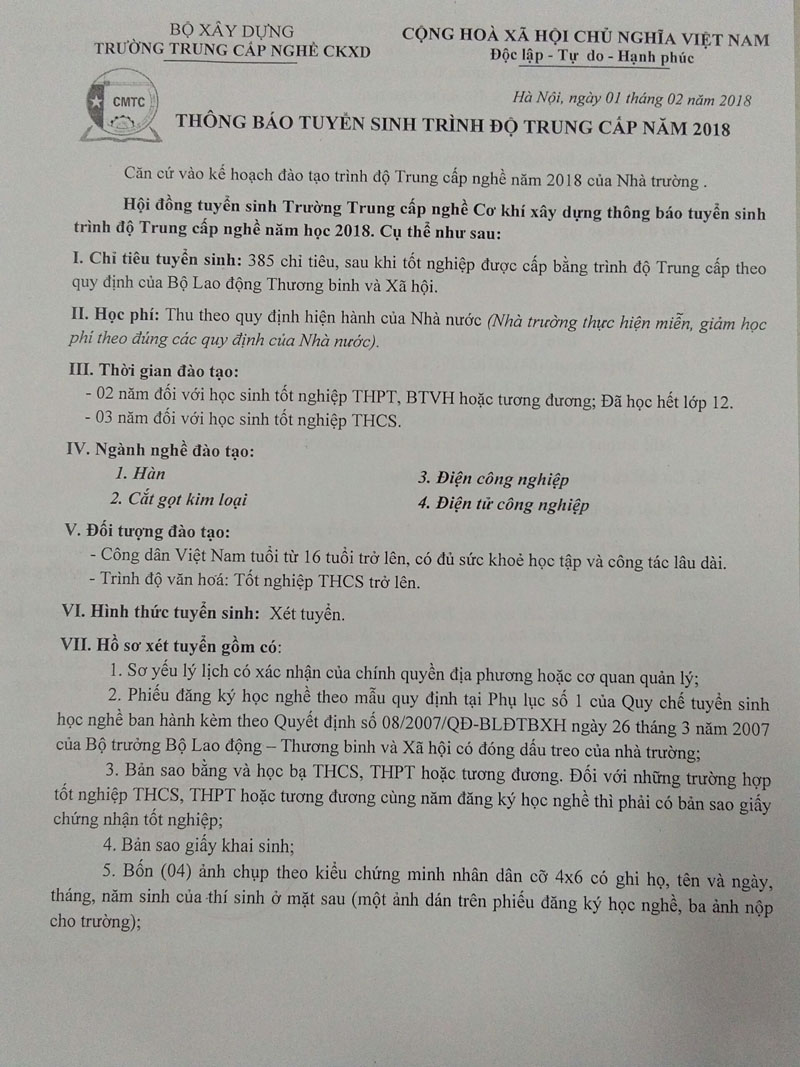 Căn cứ vào kế hoạch đào tạo trình độ Trung cấp năm 2018 của Nhà trường. Hội đồng Tuyển sinh Trường Trung cấp nghề Cơ khí xây dựng thông báo Tuyển sinh trình độ Trung cấp nghề năm 2018. Cụ thể như sau:...
