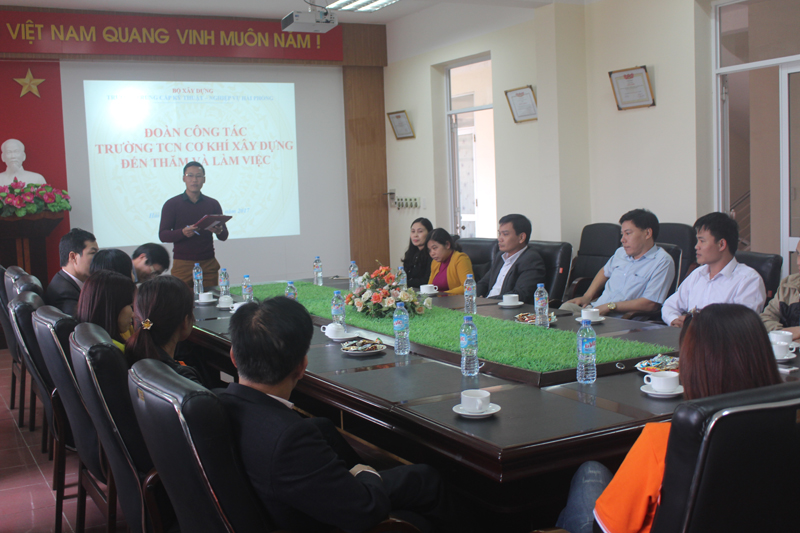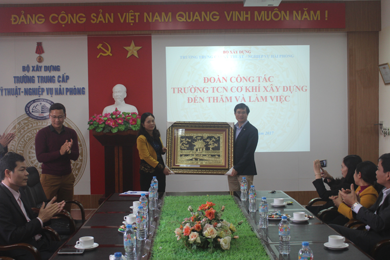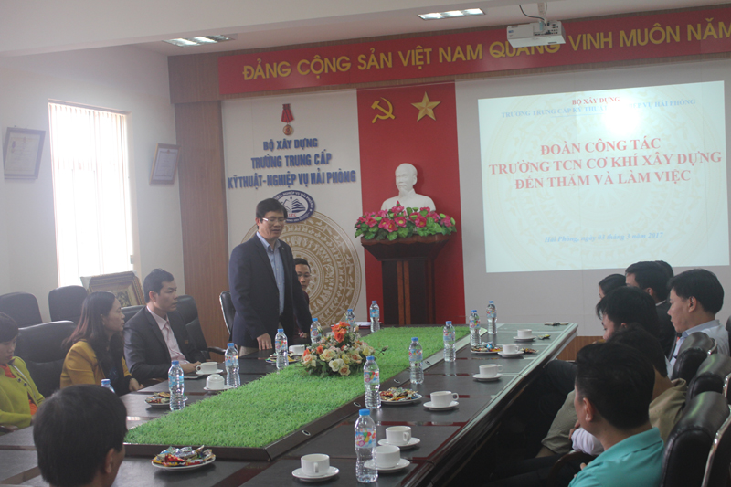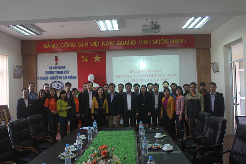 Tiếp đoàn công tác của Trường Trung cấp nghề Cơ khí xây dựng về phía Trường Trung cấp Kỹ thuật - Nghiệp vụ Hải Phòng có Thầy Lã Đình Kế - Bí thư chi bộ, Hiệu trưởng Nhà trường, các đồng chí đại diện trong ban giám hiệu, Công đoàn, Đoàn thanh niên, các Phòng khoa chức năng và đông đảo CBCNVC tham gia.