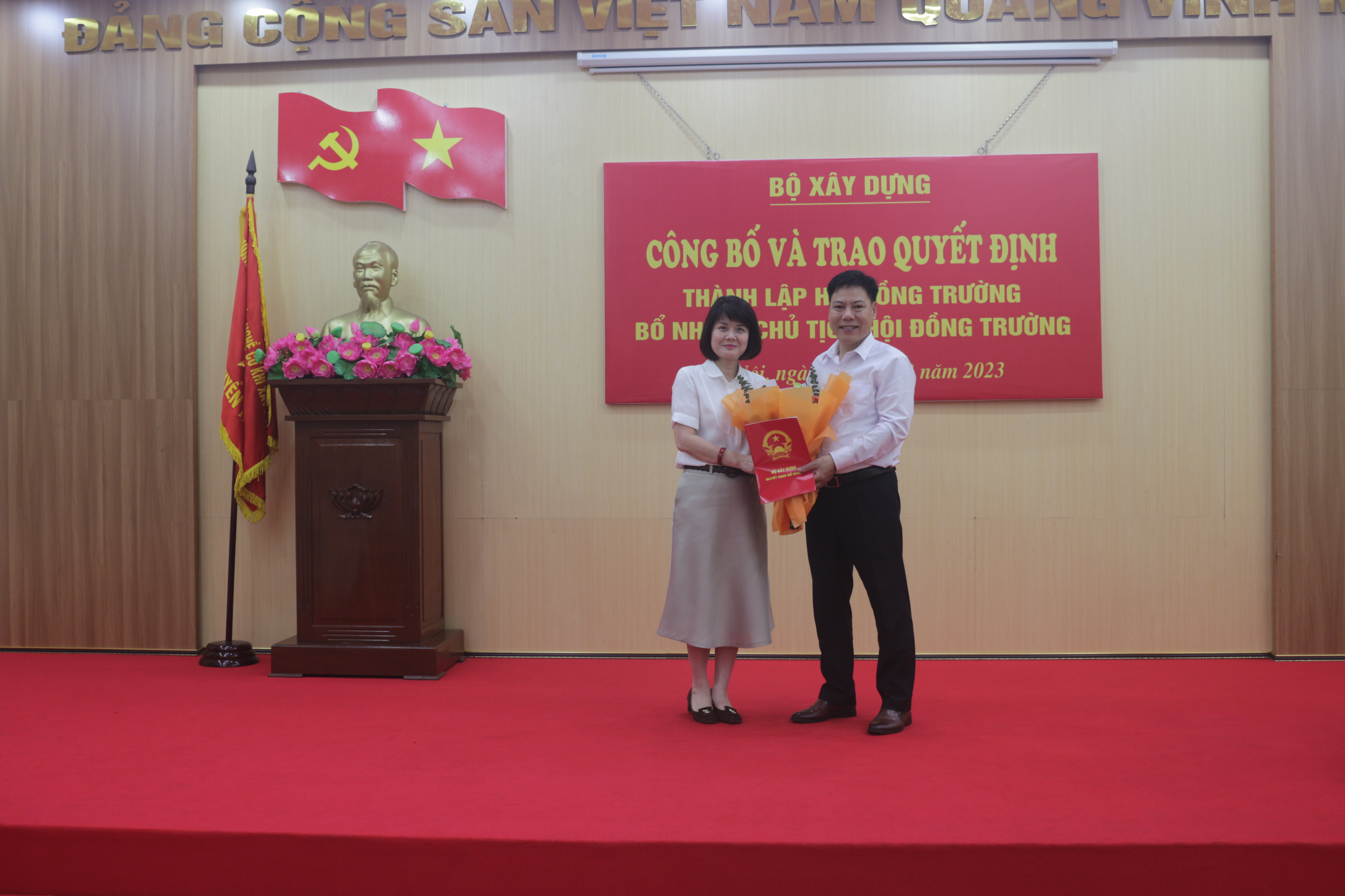 Đồng chí Nguyễn Thị Thanh Hằng - Phó Vụ trưởng Vụ Tổ chức cán bộ, Bộ Xây dựng trao Quyết định và tặng hoa chúc mừng ông Nguyễn Đình Nhâm - Chủ tịch Hội đồng trường