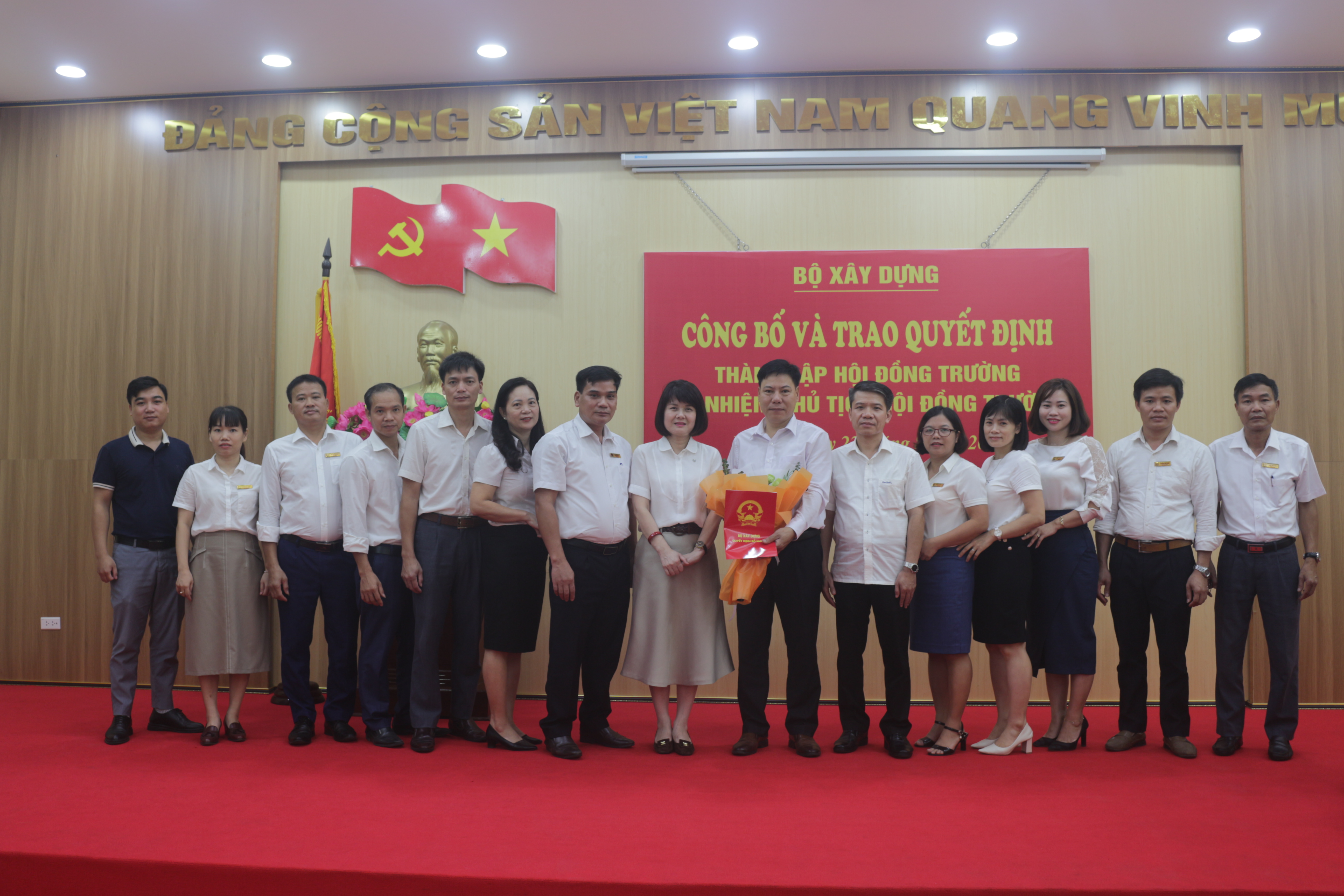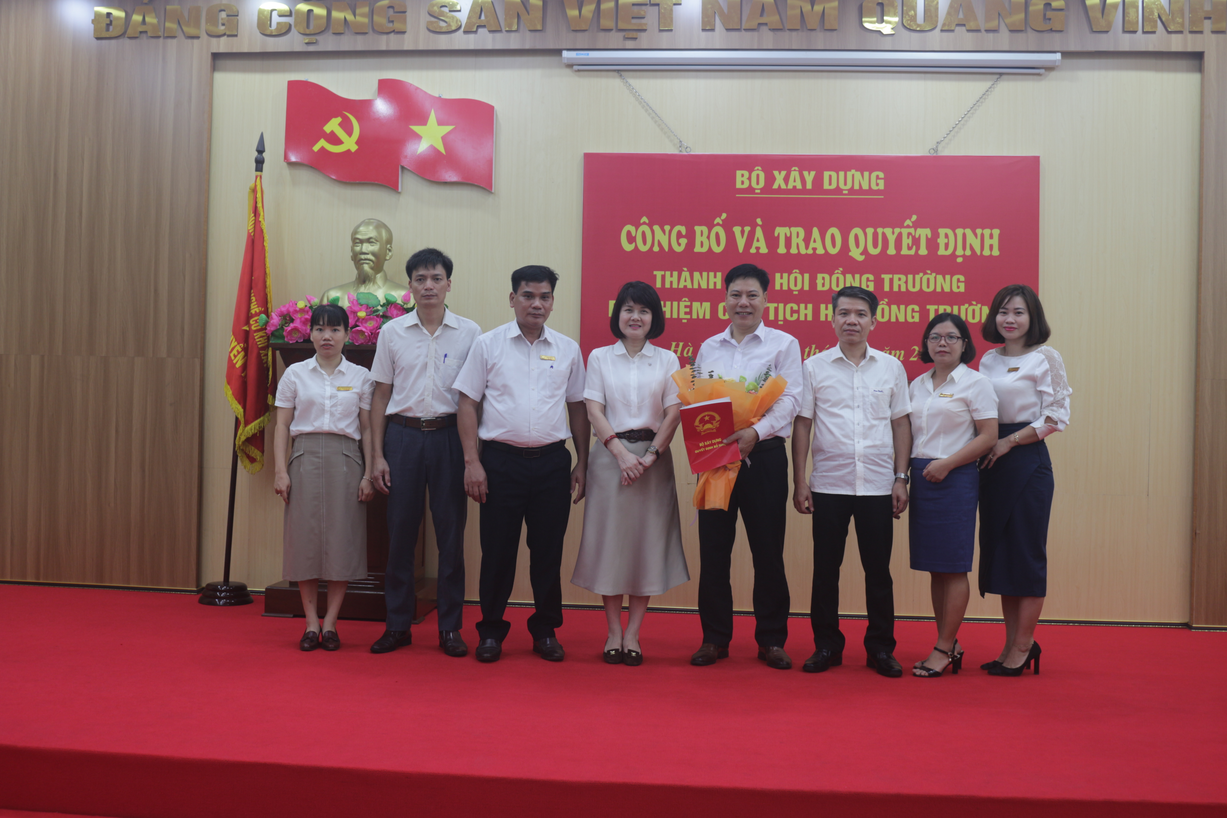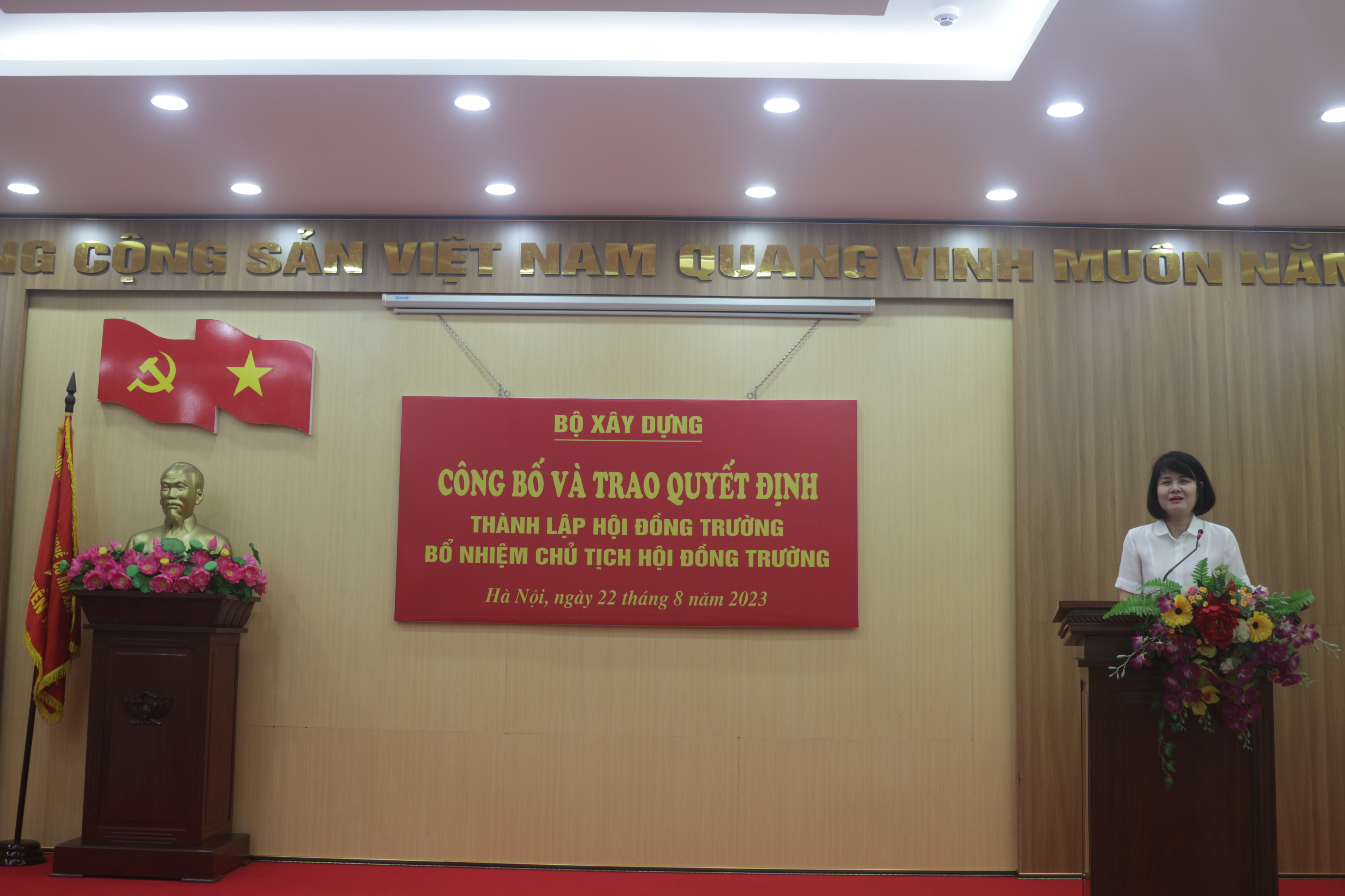 Sau phần trao Quyết định, tặng hoa chúc mừng tân Chủ tịch Hội đồng trường và chụp ảnh lưu niệm cùng Hội đồng trường, thay mặt lãnh đạo Bộ Xây dựng, đồng chí Nguyễn Thị Thanh Hằng - Phó Vụ trưởng Vụ Tổ chức cán bộ đã ghi nhận, biểu dương những thành tích mà tập thể viên chức, người lao động và học sinh nhà trường đã đạt được trong thời gian qua, đề nghị tân Chủ tịch Hội đồng trường sớm ban hành quy chế hoạt động của Hội đồng trường theo quy định để phối hợp công tác cùng tập thể lãnh đạo nhà trường đoàn kết, sáng tạo nâng cao hơn nữa uy tín, thương hiệu của Trường đồng thời mong muốn cùng với sự quyết tâm, đoàn kết, nỗ lực của tập thể viên chức và người lao động, nhà trường sẽ luôn hoàn thành tốt mọi nhiệm vụ được giao.
