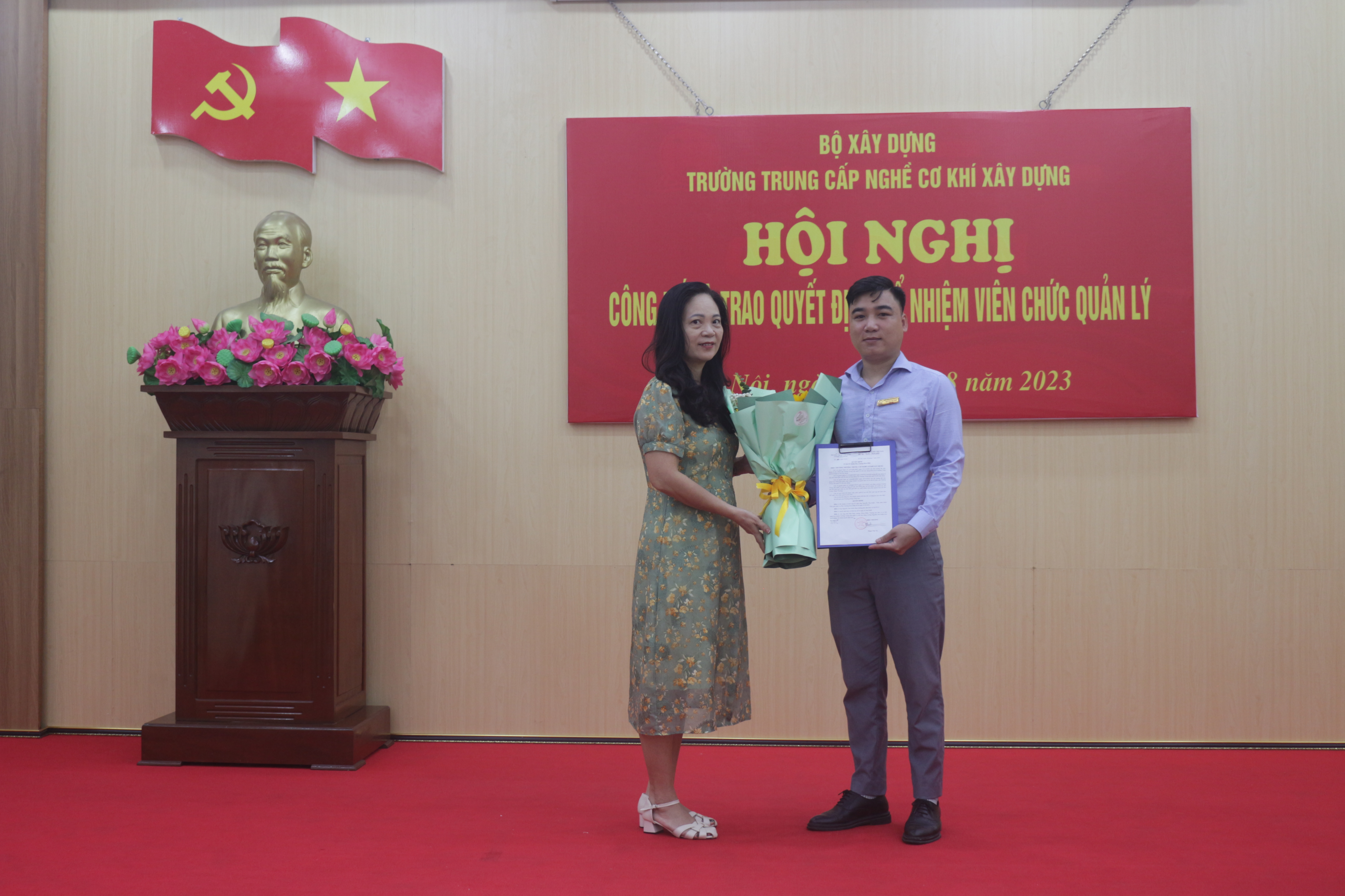 Tại Hội nghị, đồng chí Đào Văn Tiên - Trưởng phòng Tổng hợp đã công bố Quyết định của Hiệu trưởng Trường Trung cấp nghề Cơ khí xây dựng về việc bổ nhiệm ông Nguyễn Văn Huấn, Giáo viên khoa Điện giữ chức vụ Phó Trưởng khoa Điện kể từ ngày 01/8/2023. Thay mặt tập thể lãnh đạo đồng chí Bùi Thị Vân Anh đã trao Quyết định bổ nhiệm và tặng hoa chúc mừng cho đồng chí.