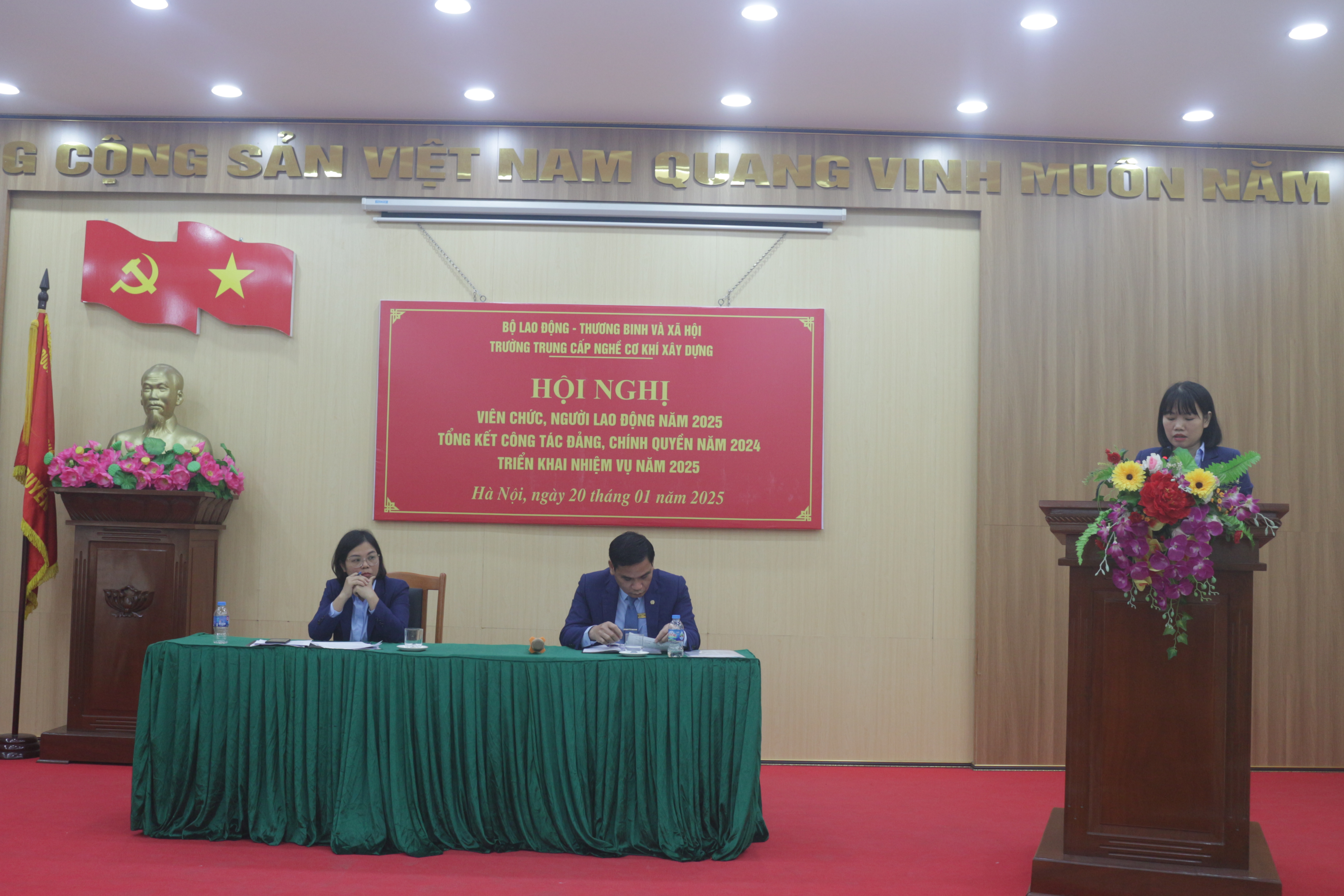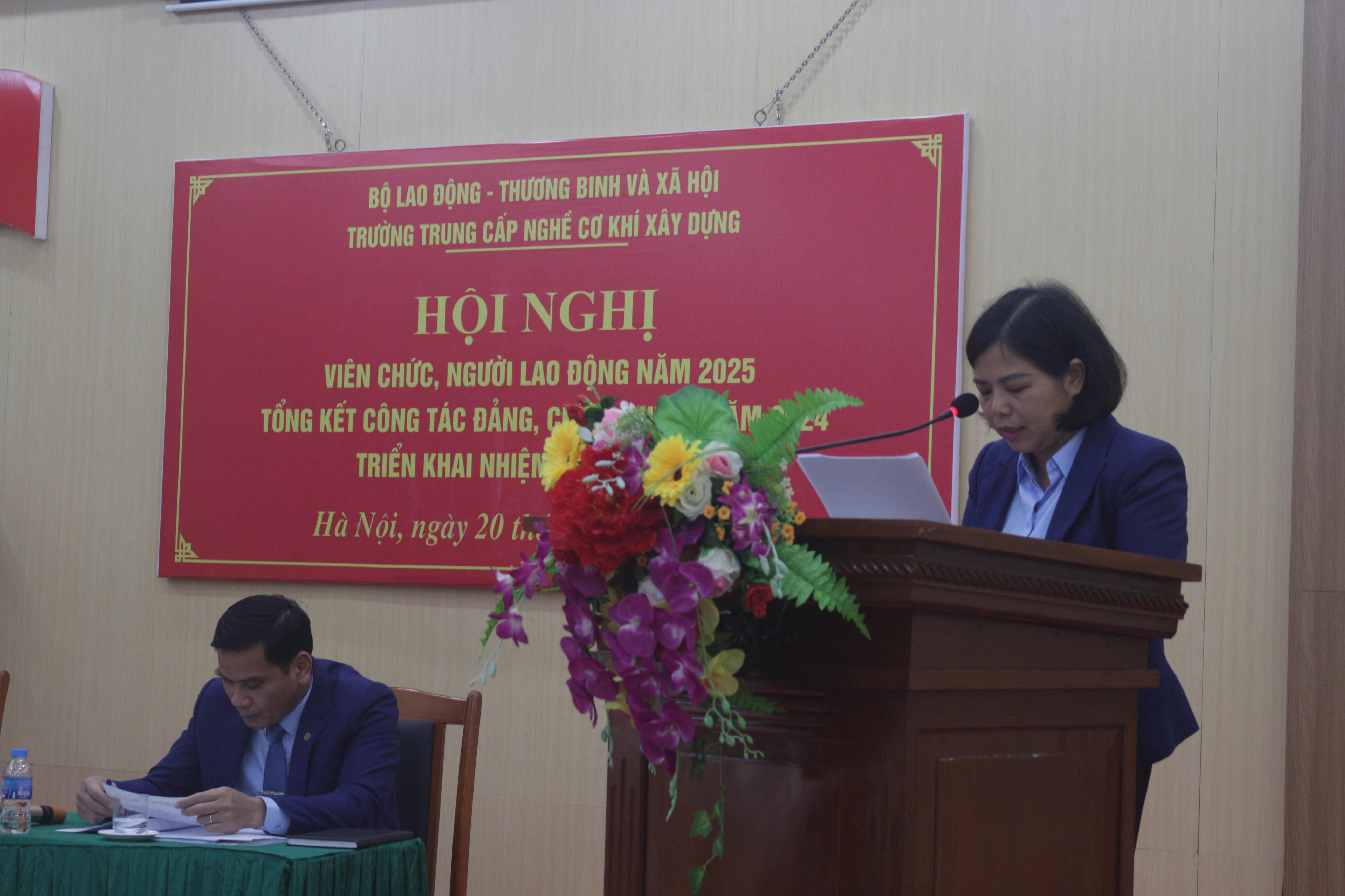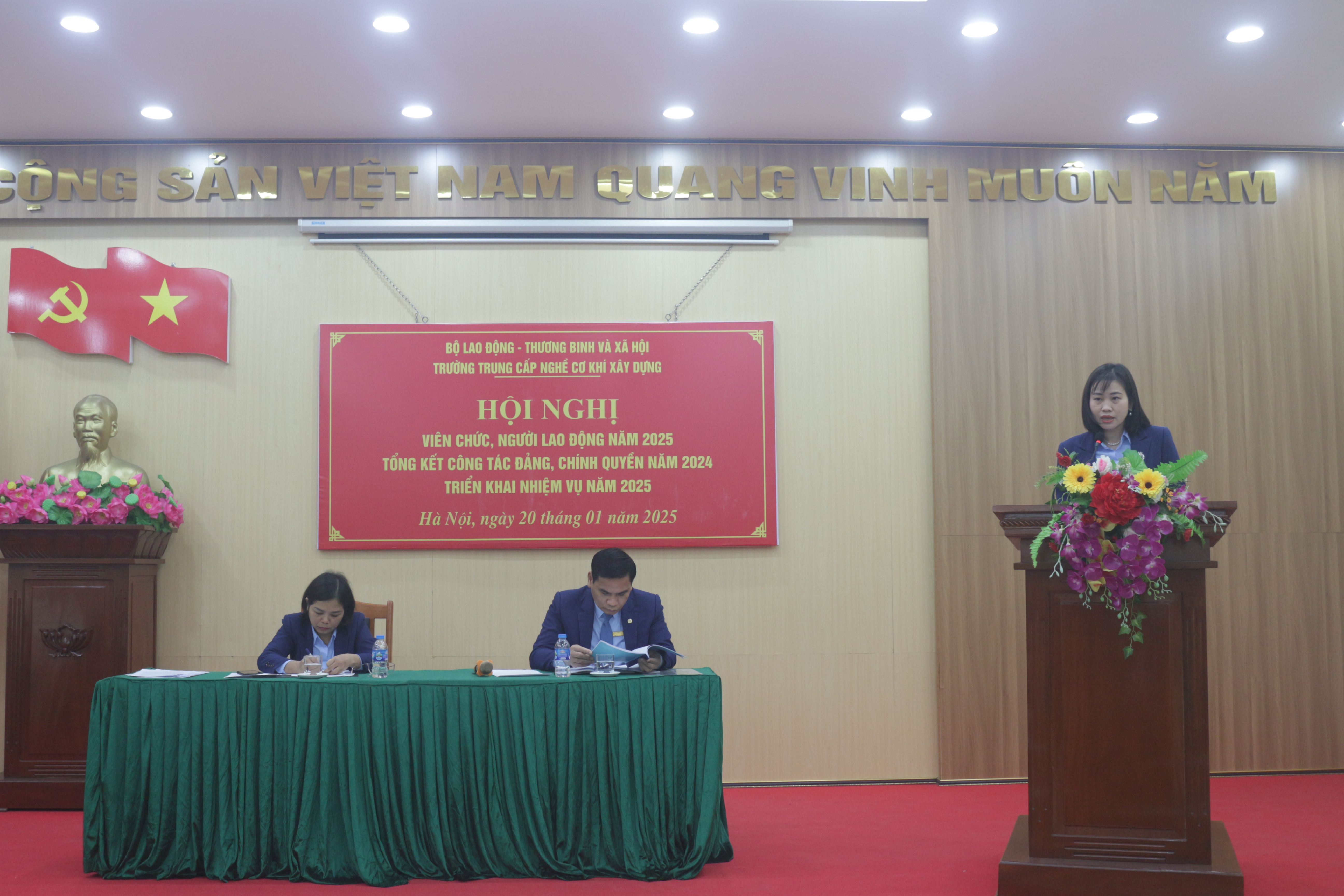 Hội nghị viên chức và người lao động năm học 2025 thể hiện sự quyết tâm và tin tưởng của viên chức và người lao động nhà trường vào sự lãnh đạo của Đảng ủy; sự quản lý, điều hành sáng suốt của lãnh đạo Trường; sự động viên khuyến khích thi đua của Công đoàn trường. Với tinh thần phát huy truyền thống tốt đẹp, chủ động đổi mới, phát triển vững vàng trong tình hình mới, tập thể viên chức và người lao động nhà trường tiếp tục đoàn kết hơn nữa, quyết tâm hơn nữa để xây dựng Trường Trung cấp nghề Cơ khí xây dựng là địa chỉ tin cậy của phụ huynh và học sinh. Với tinh thần dân chủ và nhất trí cao, Hội nghị viên chức, người lao động năm 2025; Tổng kết công tác Đảng, chính quyền năm 2024 và triển khai nhiệm vụ năm 2025 đã diễn ra thành công tốt đẹp.