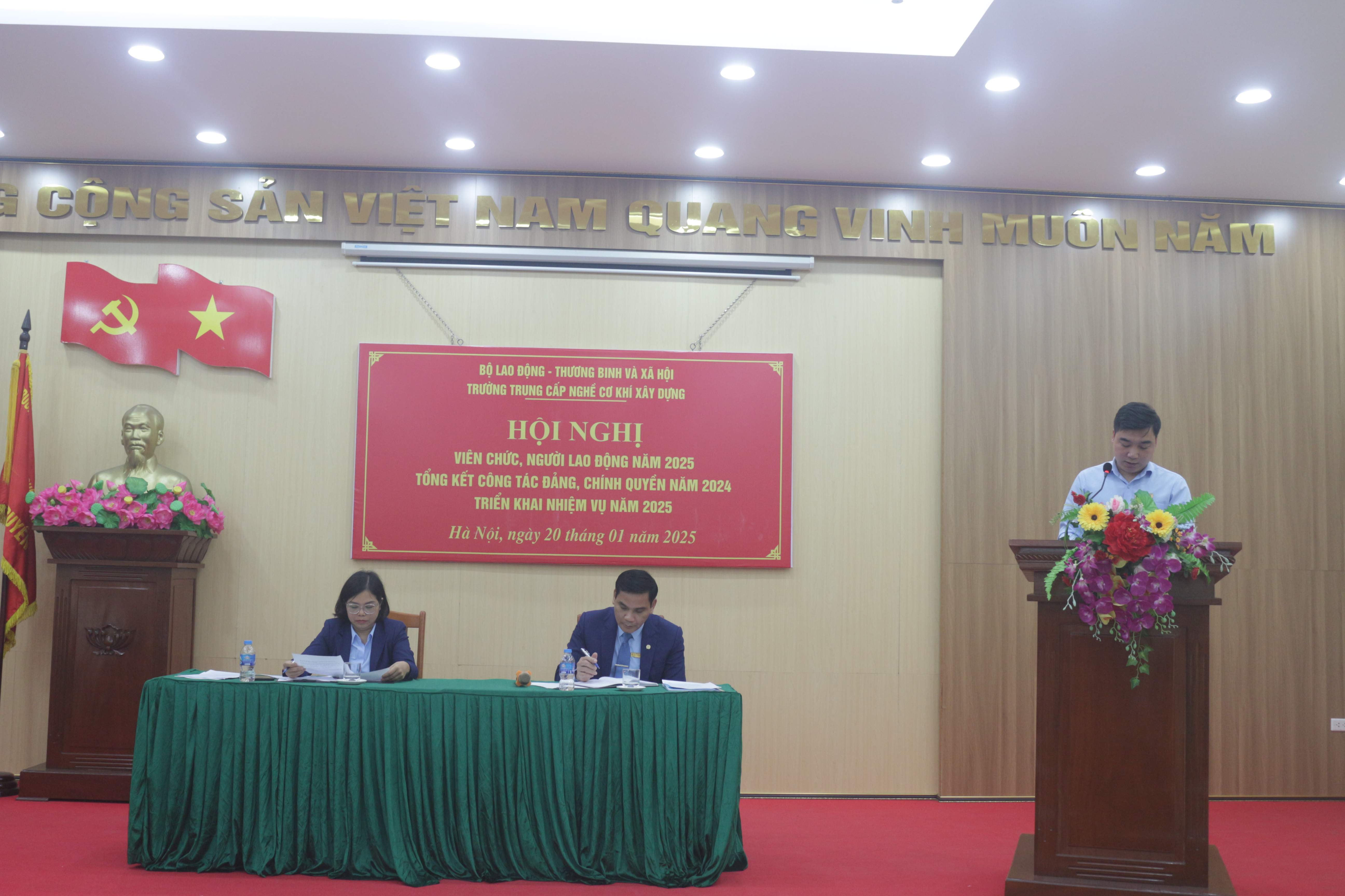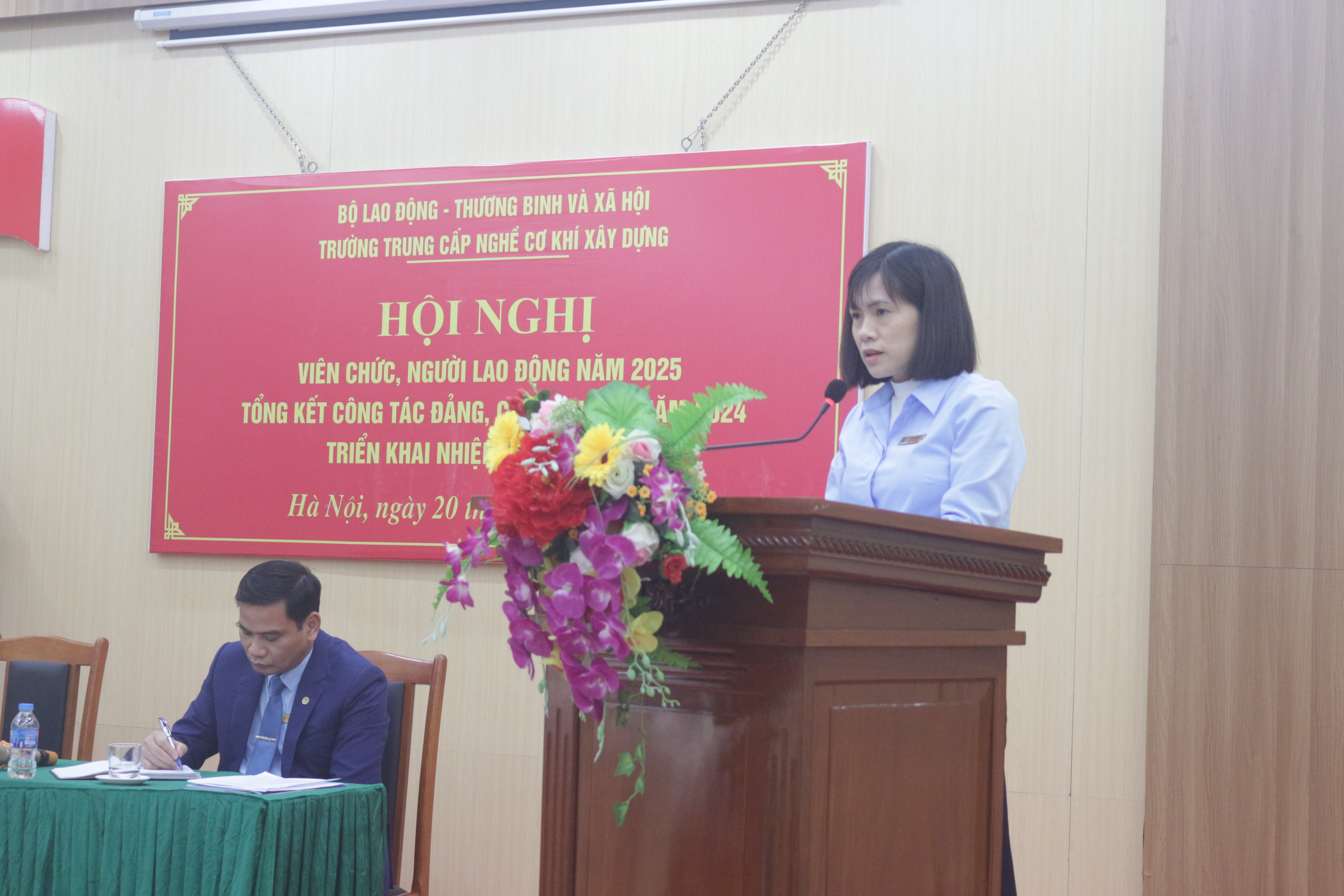 Phát biểu chỉ đạo tại Hội nghị, đồng chí Đỗ Văn Quảng – Phó Chủ tịch Công đoàn Xây dựng Việt Nam ghi nhận và biểu dương những thành tích mà viên chức, người lao động và học sinh nhà trường đã đạt được. Đồng chí cũng tin tưởng với sự quyết tâm, đoàn kết, nỗ lực của tập thể viên chức và người lao động nhà trường, trong năm 2025 Trường sẽ hoàn thành xuất sắc nhiệm vụ được giao. Đoàn Chủ tịch Hội nghị đã nghiêm túc tiếp thu những ý kiến chỉ đạo của đồng chí.