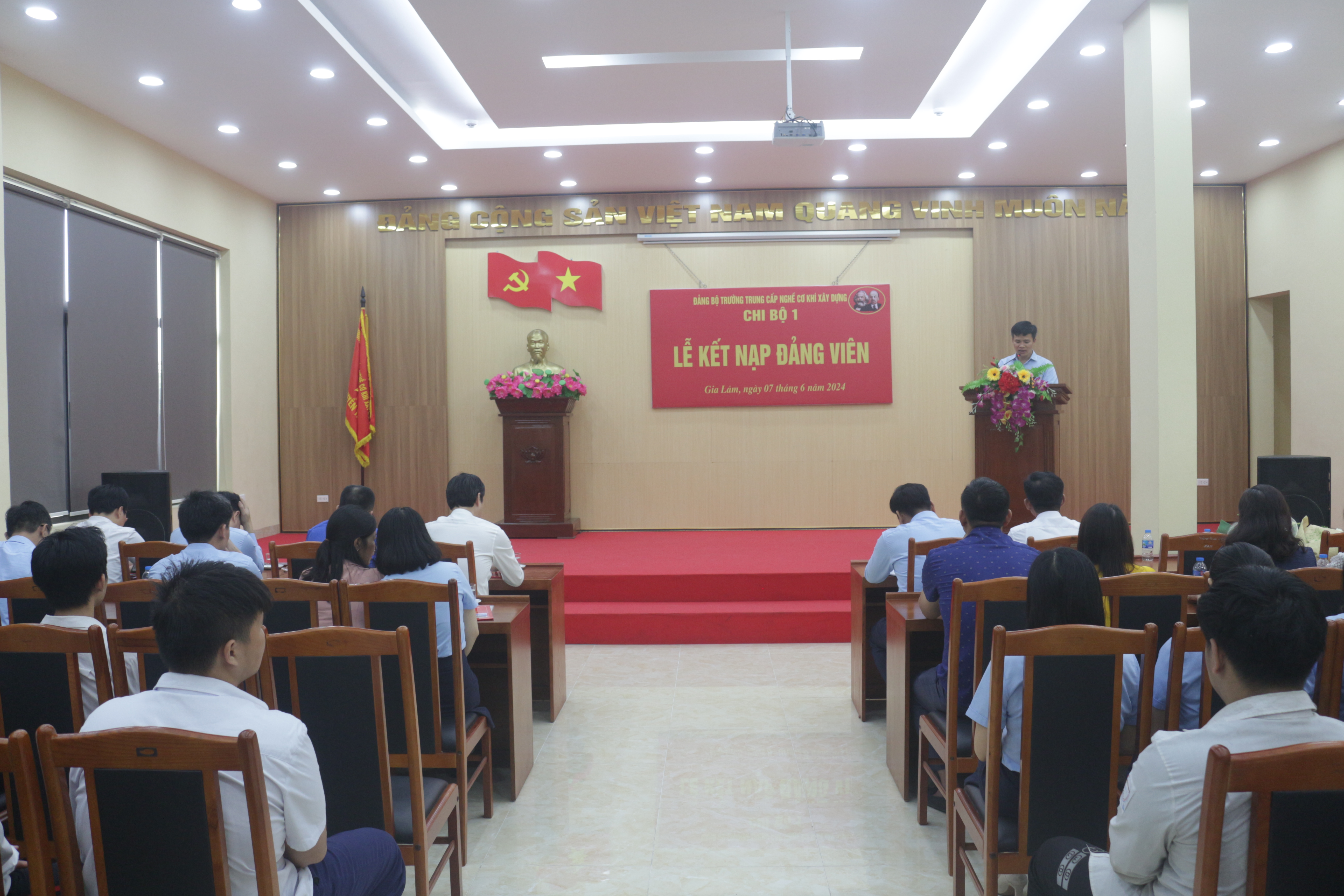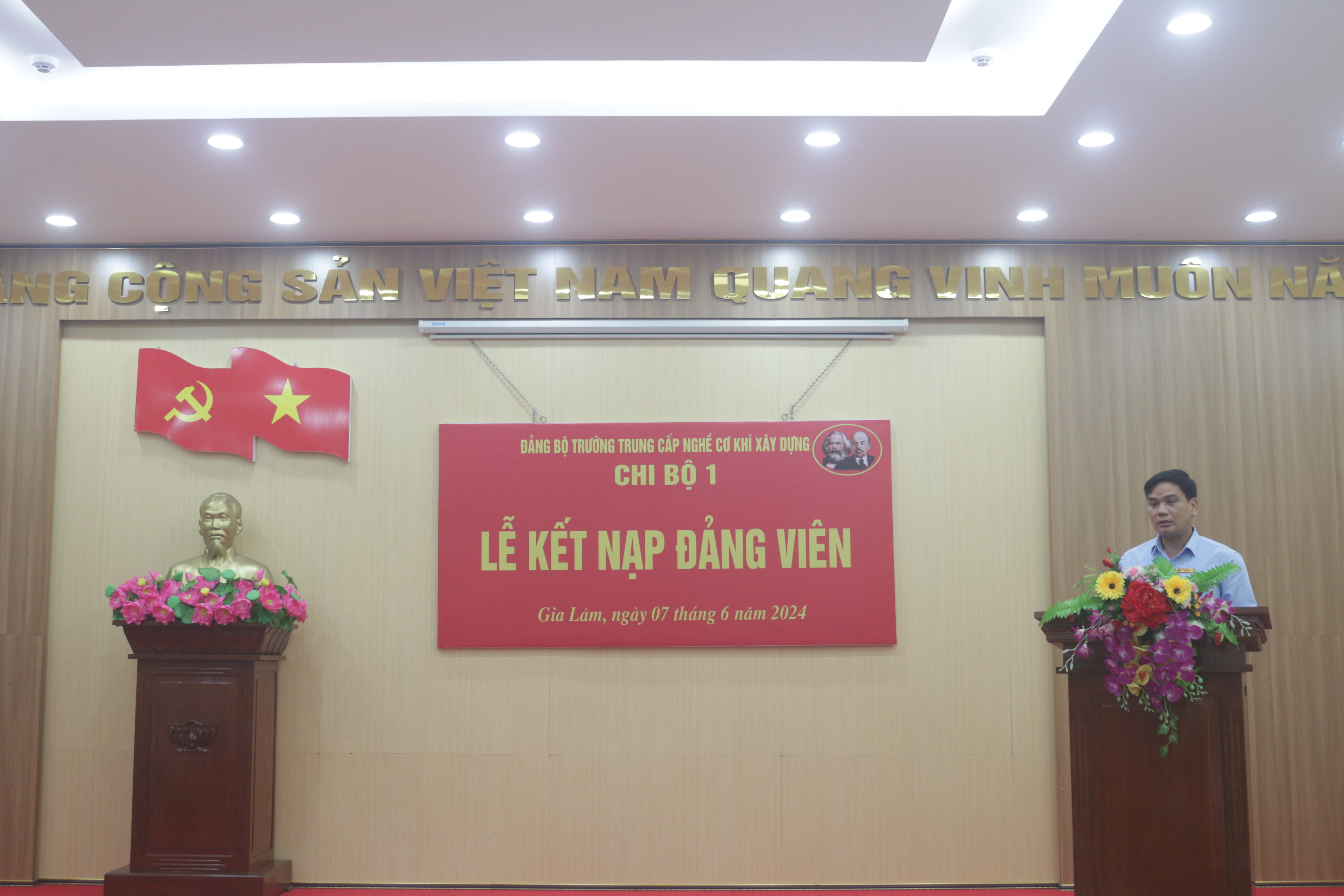 Phát biểu chỉ đạo tại buổi Lễ, đồng chí Nguyễn Tuấn Khanh, Uỷ viên BTV huyện uỷ, Trưởng Ban tổ chức huyện uỷ Gia Lâm chúc mừng Chi bộ cũng như Đảng bộ nhà trường có thêm một đảng viên trẻ mới. Đồng chí nhấn mạnh Đảng bộ Trường Trung cấp nghề Cơ khí xây dựng cần tiếp tục quan tâm đến công tác phát triển đảng viên trong toàn trường nói chung và trong học sinh nói riêng, nhằm tạo động lực mạnh mẽ cho học sinh phấn đấu trong học tập, rèn luyện và tu dưỡng, góp phần xây dựng đảng bộ ngày càng vững mạnh. Nâng cao công tác tuyên truyền, giáo dục, chủ động đề ra kế hoạch tạo nguồn để phát hiện, giới thiệu, bồi dưỡng cho học sinh. Đồng chí cũng chúc mừng và giao nhiệm vụ cho đảng viên mới tiếp tục nỗ lực học tập, rèn luyện để nâng cao hiểu biết về Đảng, phát huy trách nhiệm của một đảng viên trẻ, thúc đẩy phong trào học tập, rèn luyện và phát triển đảng trong học sinh Nhà trường.