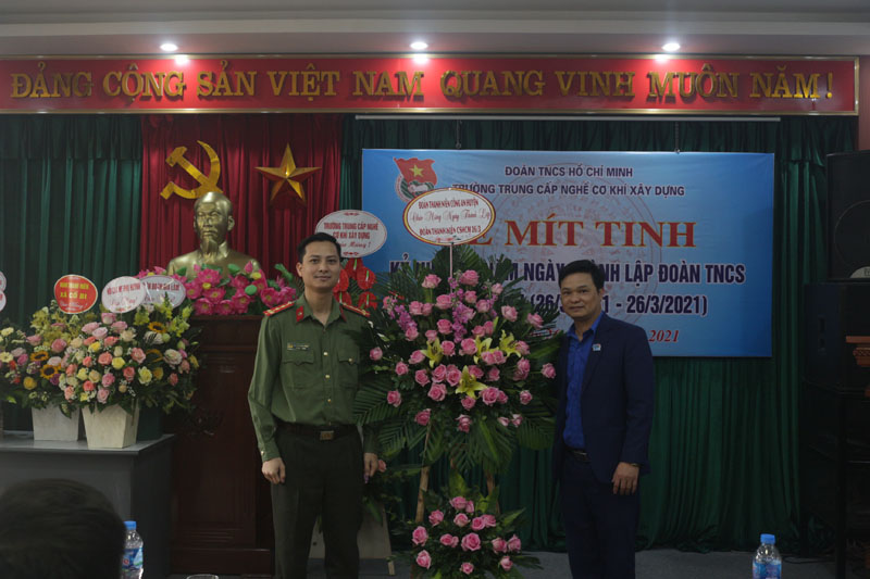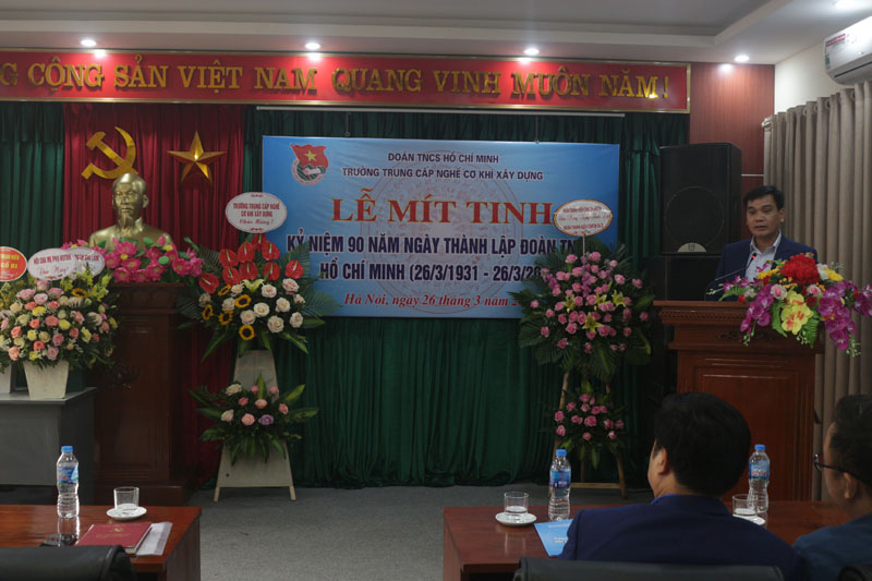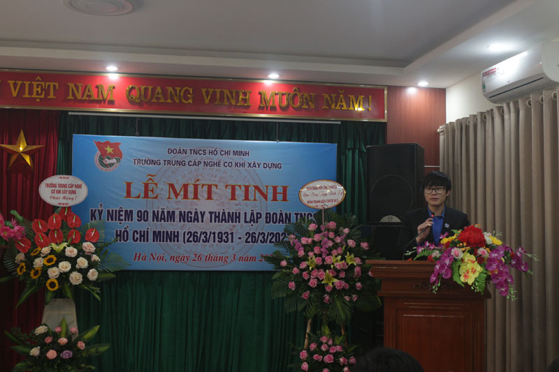 Mở đầu buổi Lễ mít tinh, Đồng chí Đặng Ngọc Cương - Bí thư Đoàn trường đã có bài diễn ôn lại truyền thống vẻ vang kỉ niệm 90 năm ngày thành lập Đoàn TNCS Hồ Chí Minh. Trải qua 90 năm xây dựng và phát triển Đoàn TNCS Hồ Chí Minh không ngừng lớn mạnh về mọi mặt, phát huy tinh thần xung kích của tuổi trẻ phấn đấu và cống hiến sức lực cho công cuộc xây dựng và phát triển đất nước, xứng đáng với sự tin cậy của Đảng Cộng sản Việt Nam. Phát huy truyền thống của các thế hệ thanh niên Việt Nam, trong những năm qua, Đoàn thanh niên Trường Trung cấp nghề Cơ khí xây dựng luôn giữ được vai trò nòng cốt trong công tác giáo dục, bồi dưỡng và định hướng tư tưởng, tạo môi trường tốt để các đoàn viên phấn đấu thi đua học tập, rèn luyện. Tuổi trẻ Nhà trường hòa cùng tuổi trẻ cả nước tiếp tục nêu cao tinh thần xung kích, tình nguyện trong mọi hoạt động để luôn là ngọn cờ đầu trong công tác thanh niên, góp phần vào sự nghiệp xây dựng và phát triển Nhà trường ngày càng phát triển.
