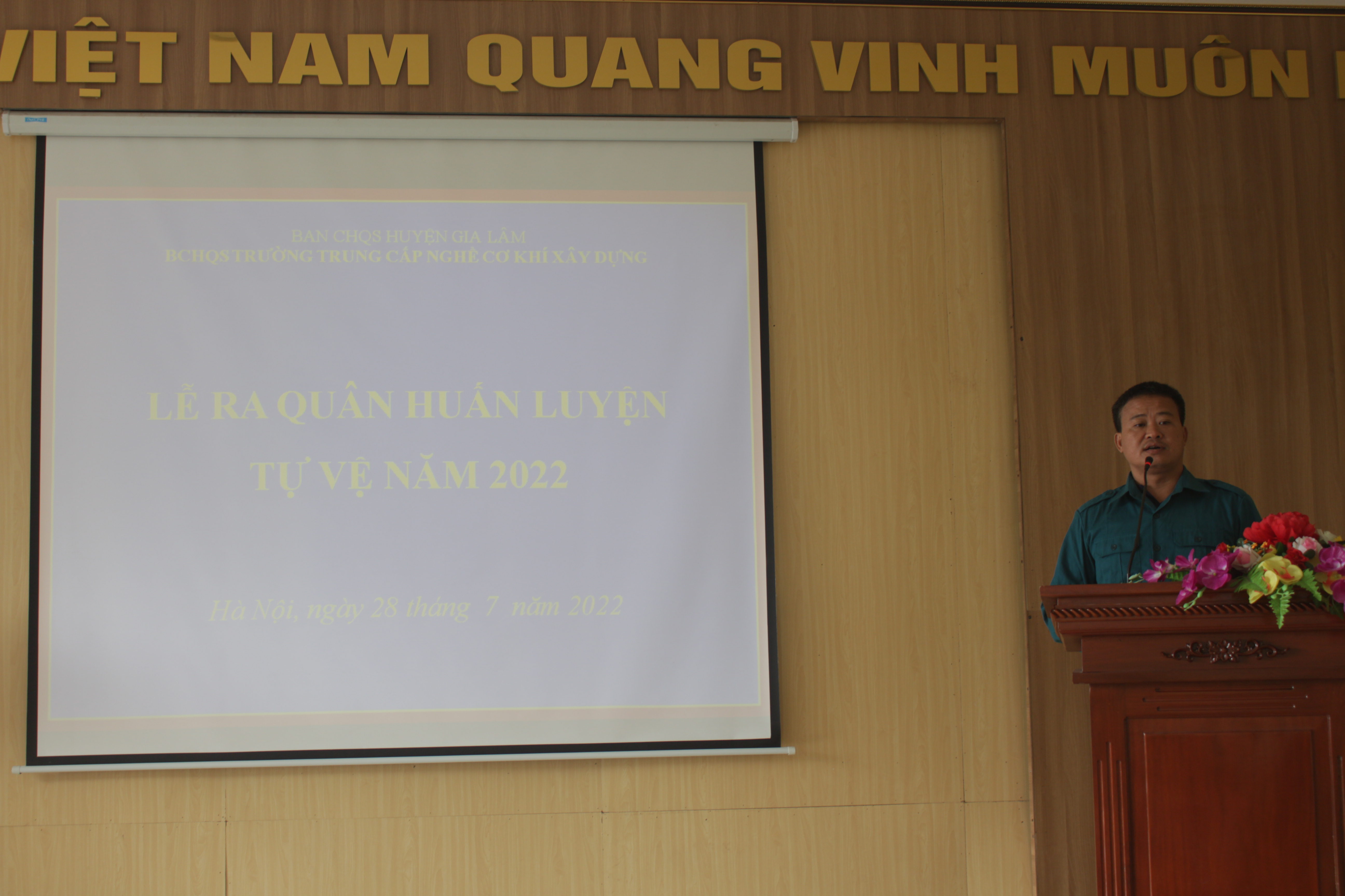 Phát biểu tại buổi Lễ ra quân, đồng chí Đỗ Tuấn Nghĩa, Trưởng khoa Cơ khí, Chỉ huy phó Ban CHQS Trường Trung cấp nghề Cơ khí xây dựng yêu cầu tổ chức huấn luyện những kiến thức cơ bản về quân sự, sử dụng các loại vũ khí được trang bị, vũ khí tự tạo; biết chiến thuật tổ, Trung đội Tự vệ, đủ khả năng hoàn thành nhiệm vụ trong mọi tình huống. Tổ chức huấn luyện chặt chẽ, nghiêm túc, đủ quân số; làm tốt công tác chuẩn bị huấn luyện và công tác bảo đảm khác cho huấn luyện; vận dụng tốt các quan điểm, nguyên tắc và mối kết hợp trong huấn luyện; biết vận dụng vào thực tế khi có tình huống xảy ra và đặc biệt bảo đảm an toàn tuyệt đối về người và vũ khí trang bị trước, trong và sau khi huấn luyện. Đây là dịp để mỗi cán bộ, chiến sỹ tự vệ của Trường rèn luyện các kỹ năng, tác phong, kỷ cương, kỷ luật để từ đó góp phần cùng các lực lượng giữ vững an ninh chính trị, trật tự an toàn xã hội trên địa bàn huyện Gia Lâm, đáp ứng yêu cầu, nhiệm vụ quân sự tại địa phương, cơ quan, đơn vị.