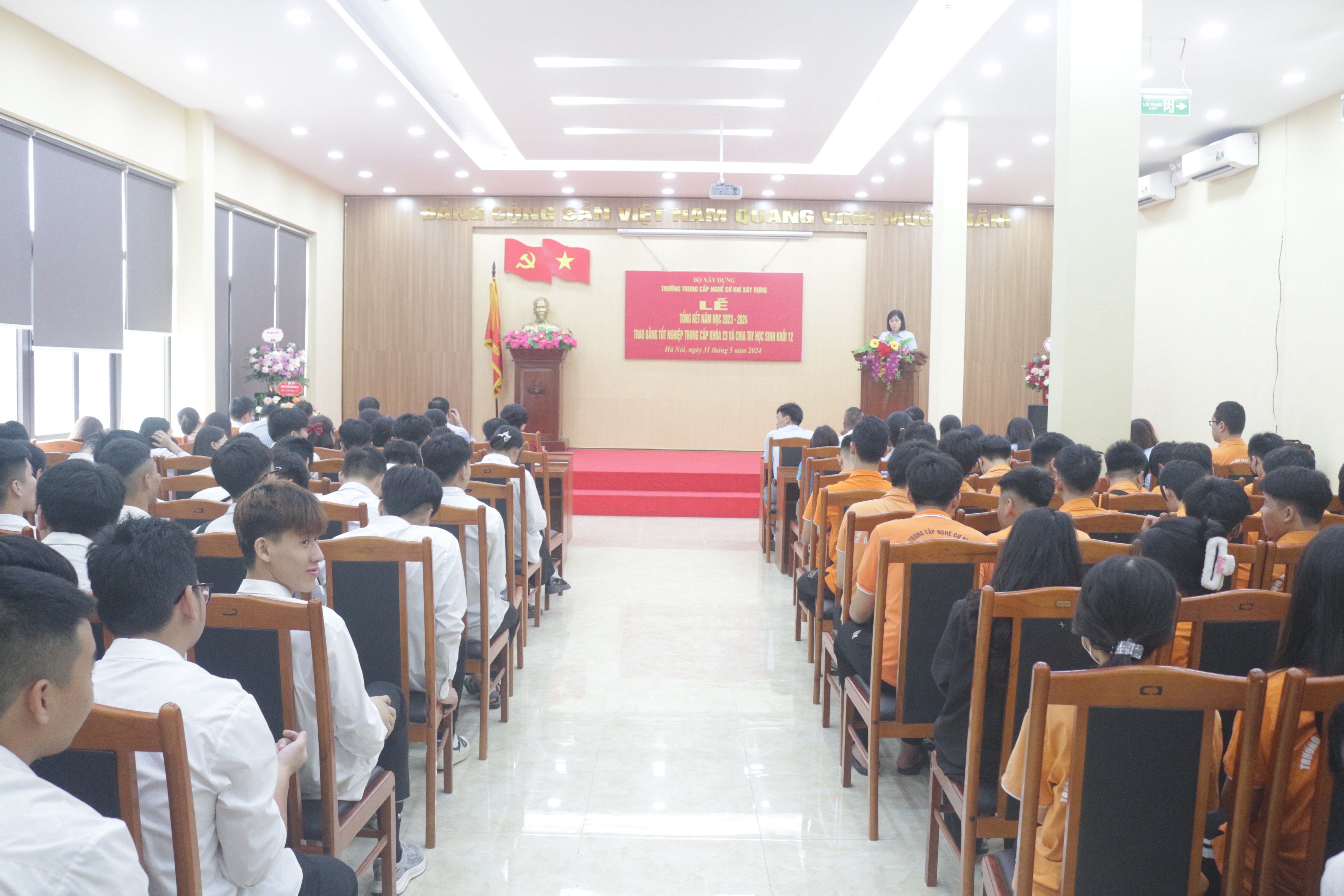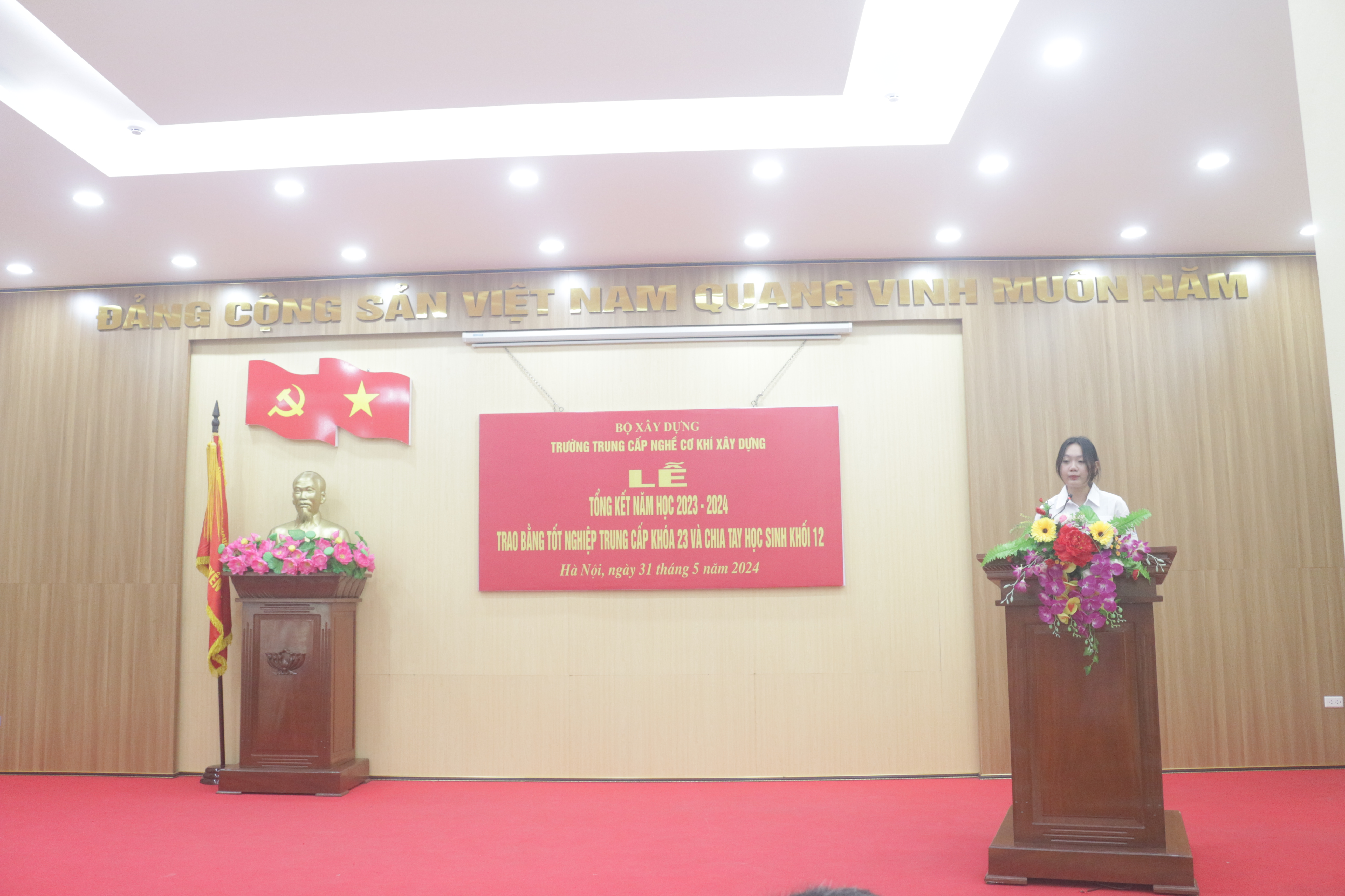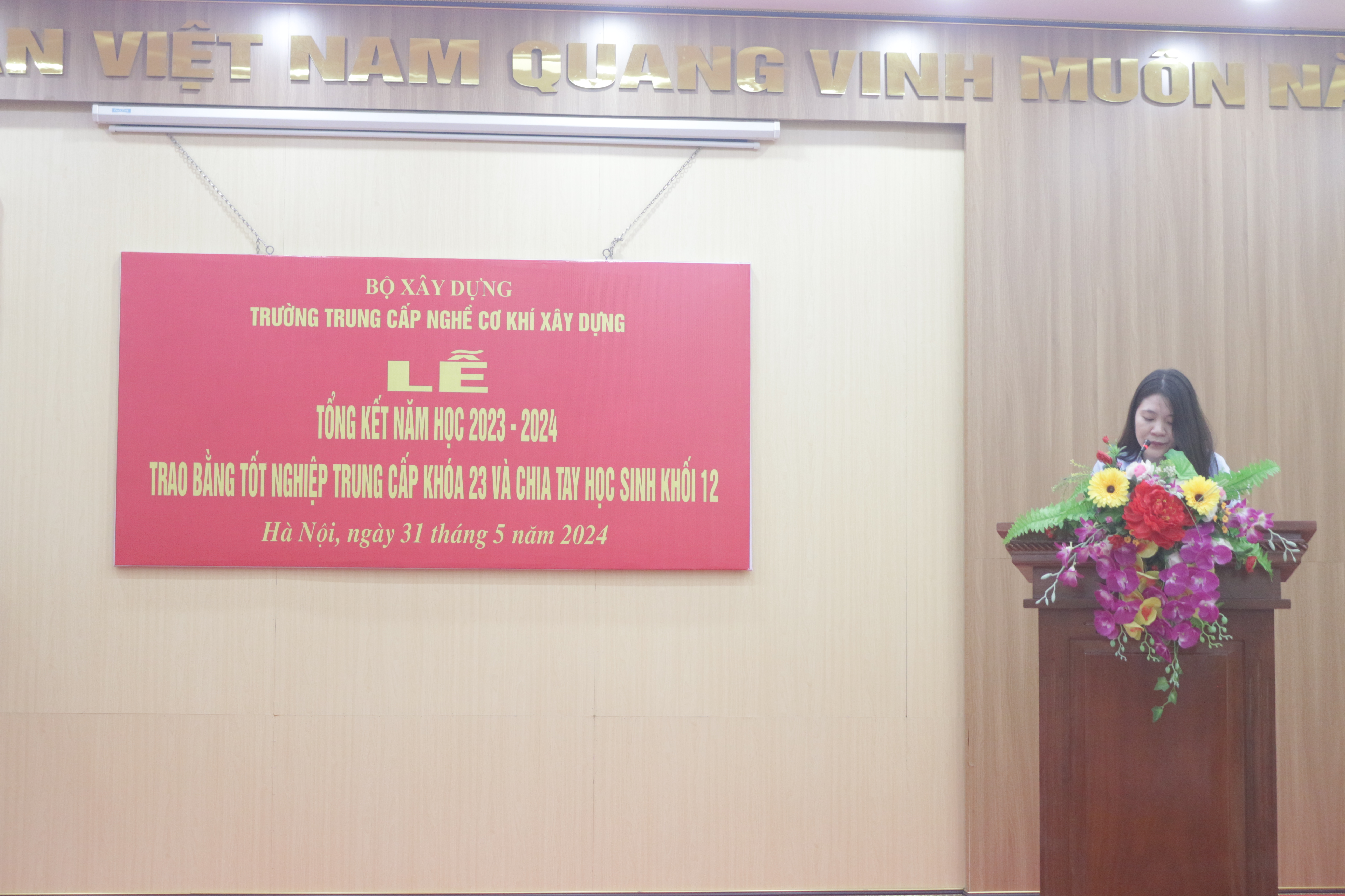 Tại buổi Lễ, đồng chí Vũ Thị Phược, Trưởng phòng Kế hoạch - Đào tạo đã trình bày Báo cáo tổng kết năm học 2023 - 2024 nhằm điểm lại những kết quả mà thầy và trò nhà trường đã đạt được trong năm học vừa qua, đồng thời rút ra những bài học kinh nghiệm cho năm học mới, công bố quyết định công nhận tốt nghiệp cho học sinh khóa 23, các quyết định khen thưởng cho học sinh đạt nhiều thành tích trong năm học, khóa học và điều hành phần trao bằng tốt nghiệp trung cấp, khen thưởng. Đây không chỉ là sự động viên, khích lệ kịp thời đến các tập thể, cá nhân mà còn thể hiện sự quan tâm sát sao của Ban giám hiệu đến hoạt động dạy và học của nhà trường, đồng thời tạo động lực cho các tập thể, cá nhân tích cực, nỗ lực hơn nữa trong năm học mới.