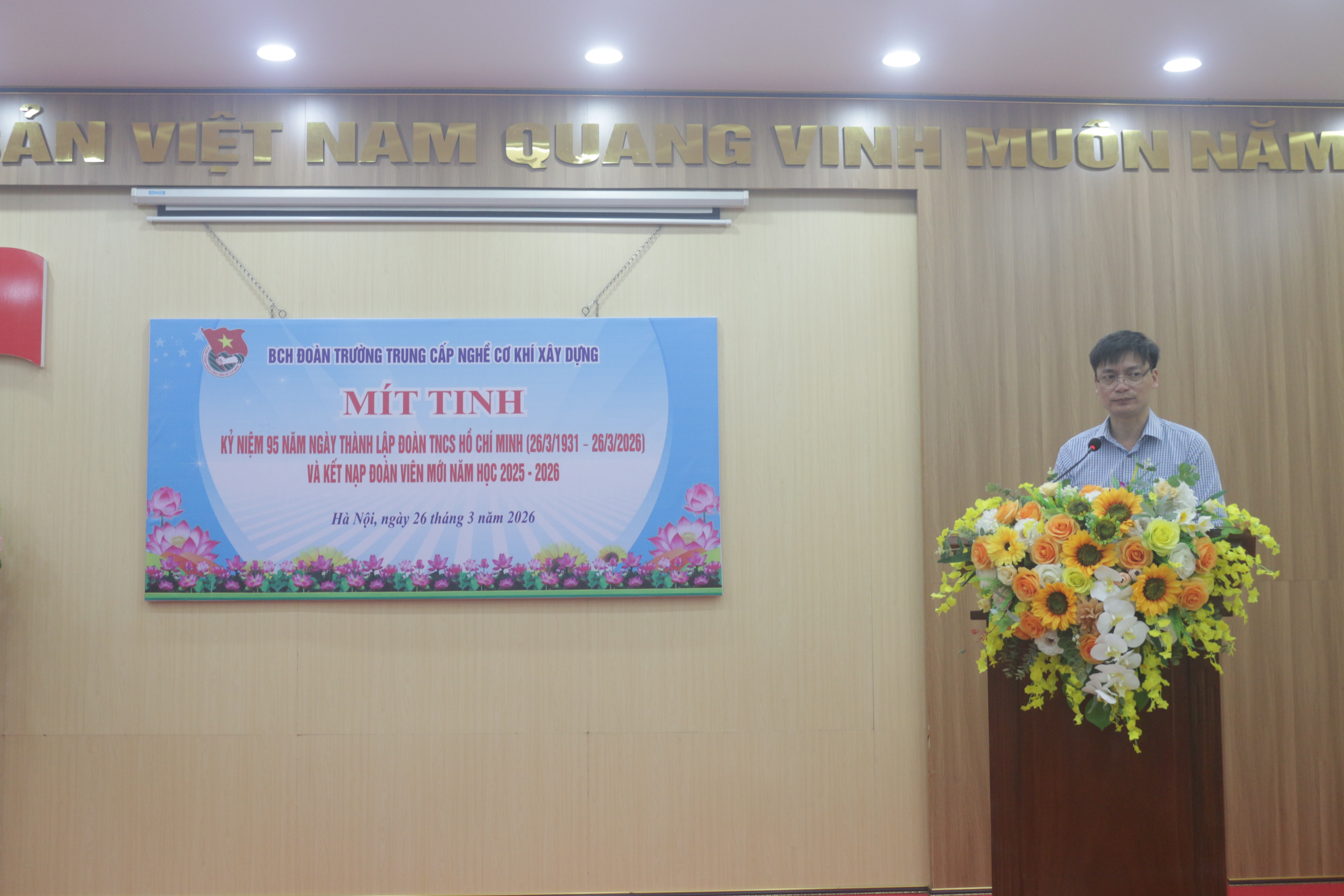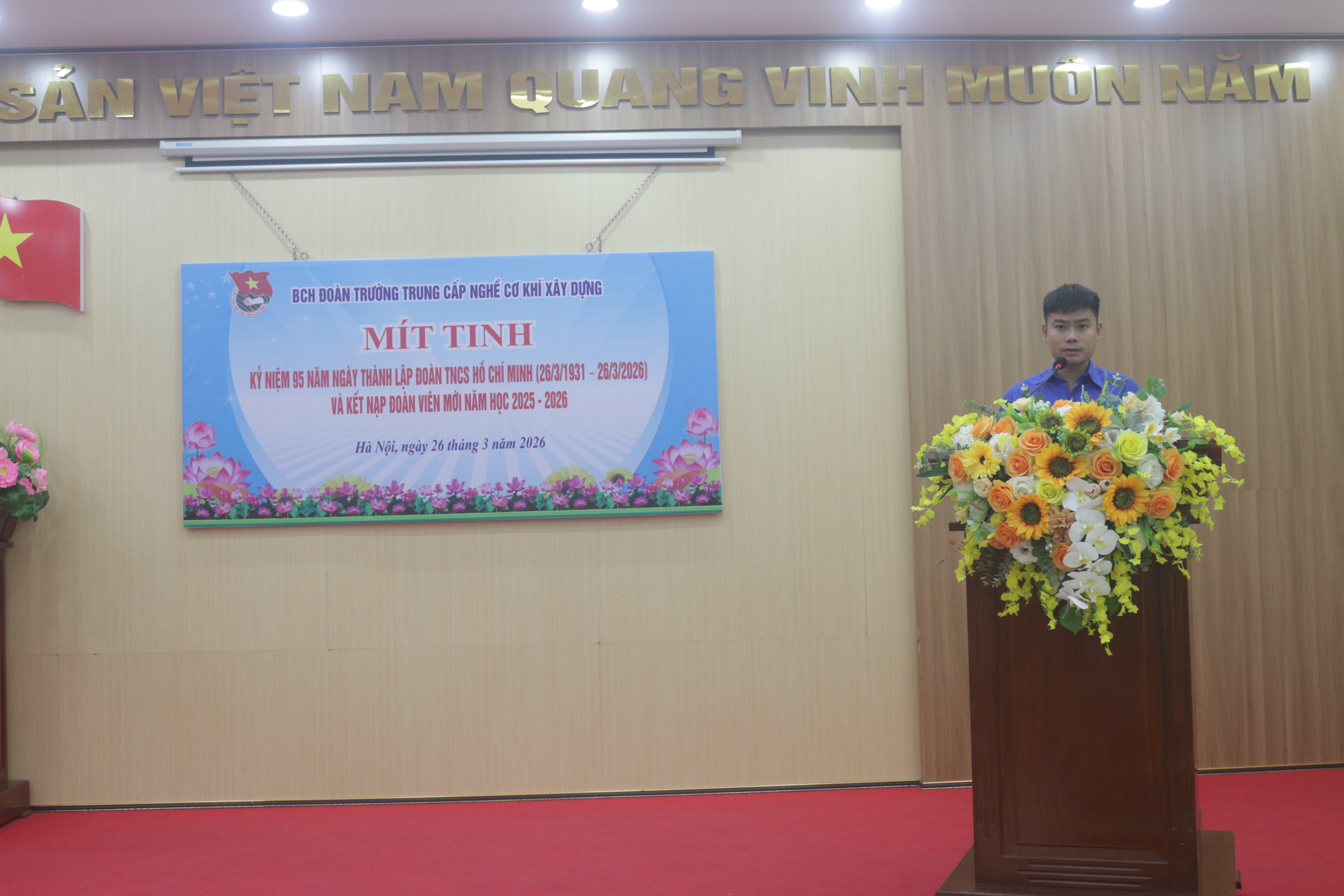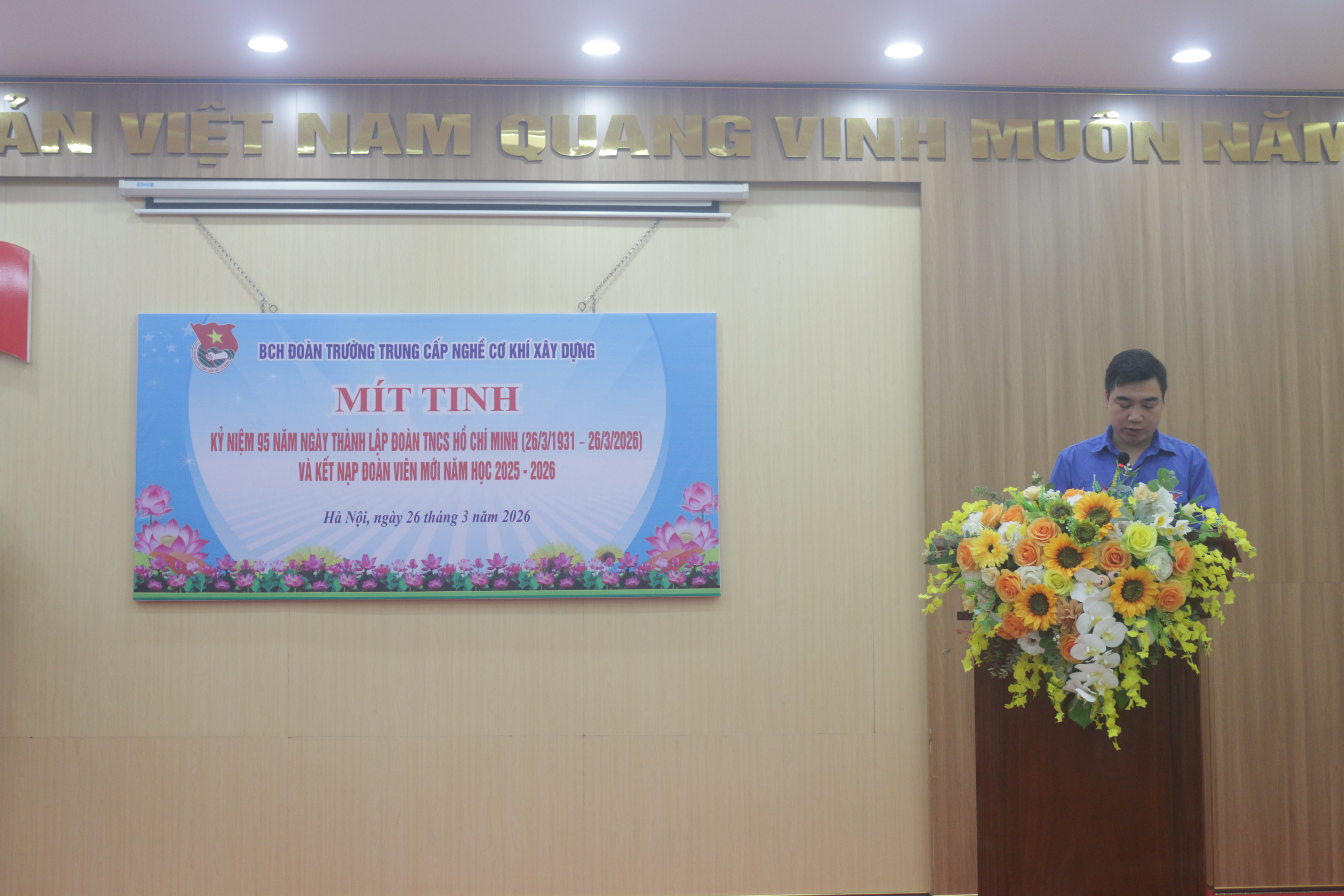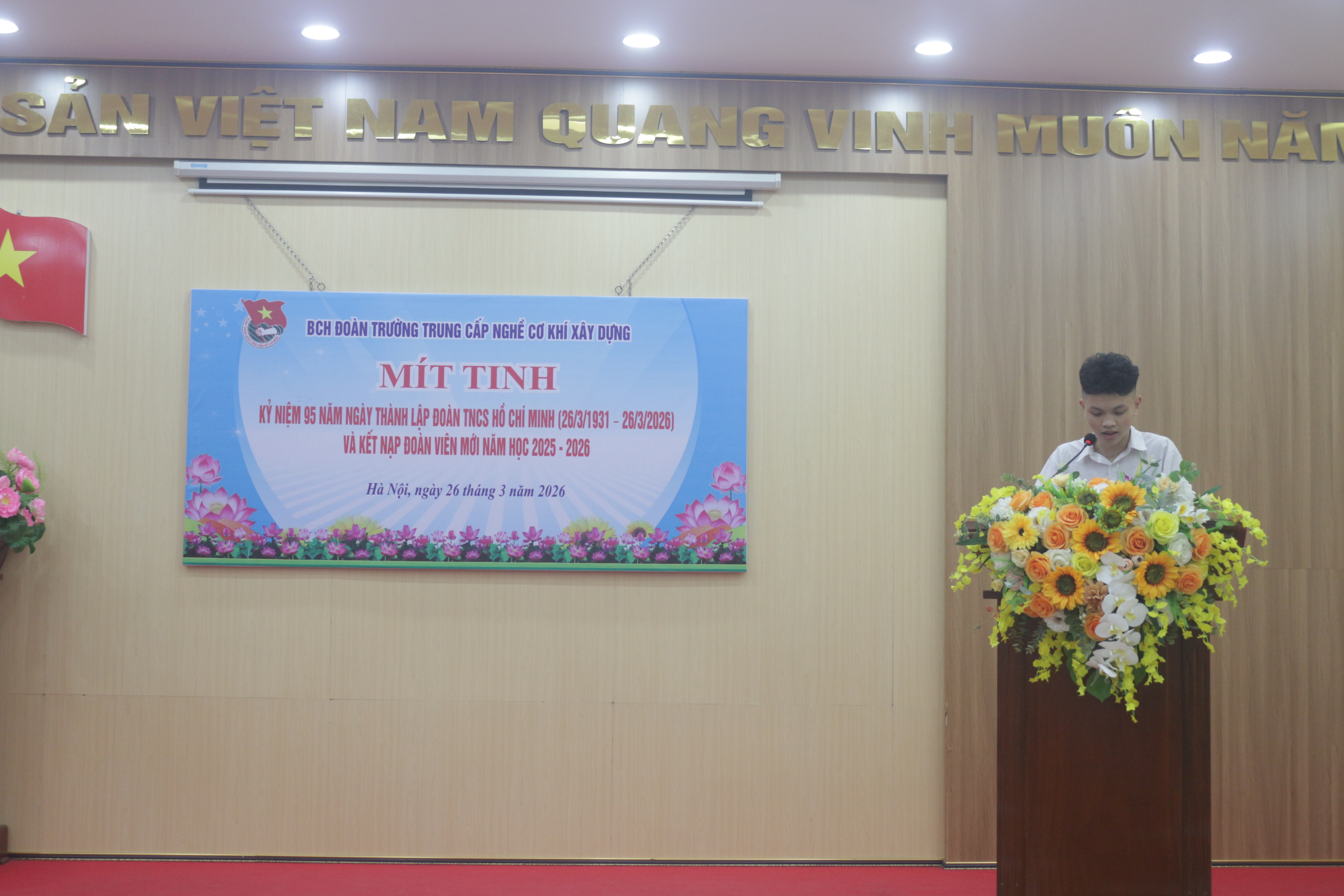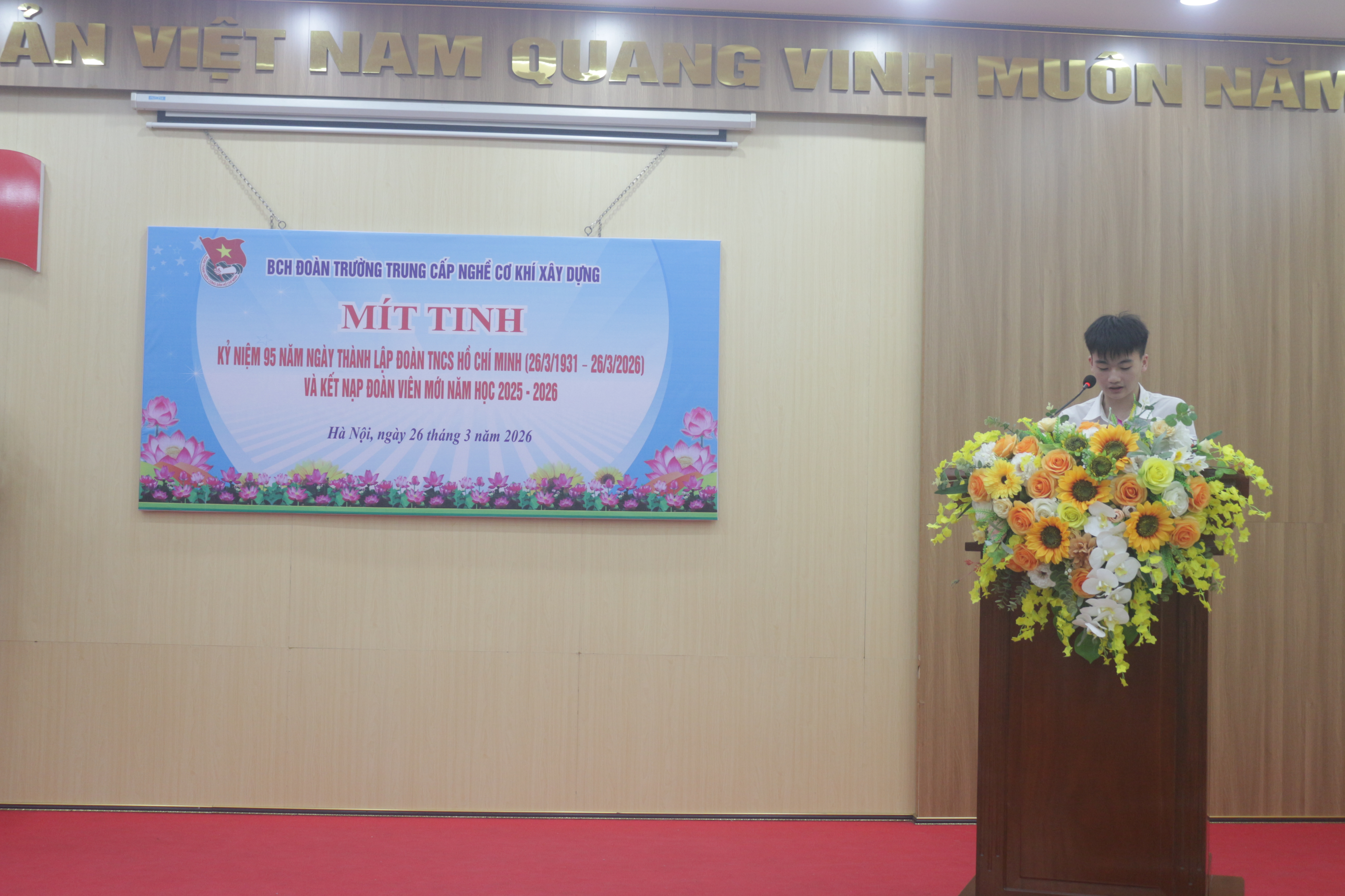Sáng ngày 26 tháng 3 năm 2026, Đoàn thanh niên Cộng sản Hồ Chí Minh Trường Trung cấp nghề Cơ khí xây dựng đã long trọng tổ chức Mít tinh Kỷ niệm 95 năm ngày thành lập Đoàn thanh niên Cộng sản Hồ Chí Minh (26/3/1931 - 26/3/2026) và kết nạp đoàn viên mới năm học 2025 - 2026.