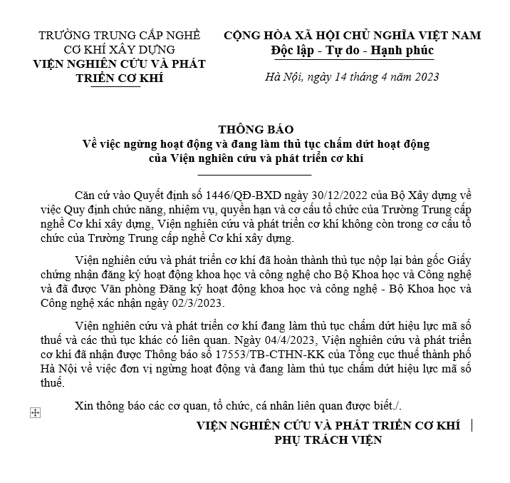 Thông báo về việc đơn vị ngừng hoạt động và đang làm thủ tục chấm dứt mã số thuế