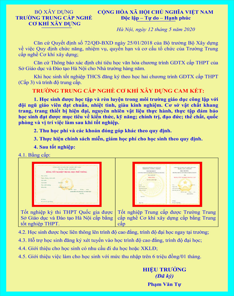 Trường Trung cấp nghề Cơ khí xây dựng cam kết: